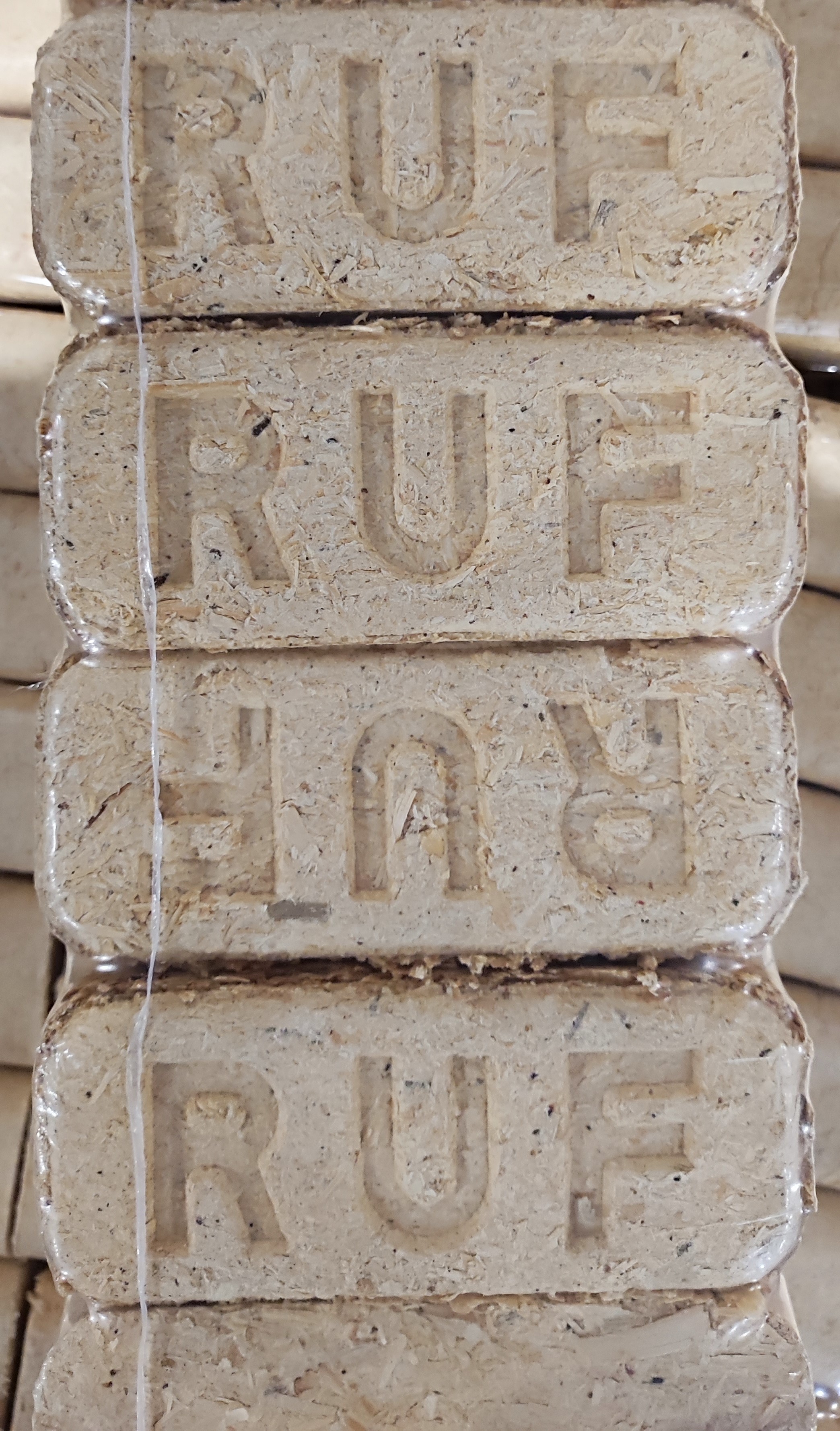 Ruf briketes ražošana notiek tikai no tīrām kokskaidām, blīvi sapresētas, kas nodrošina augstu siltumatdevi un ilgdegšanu.